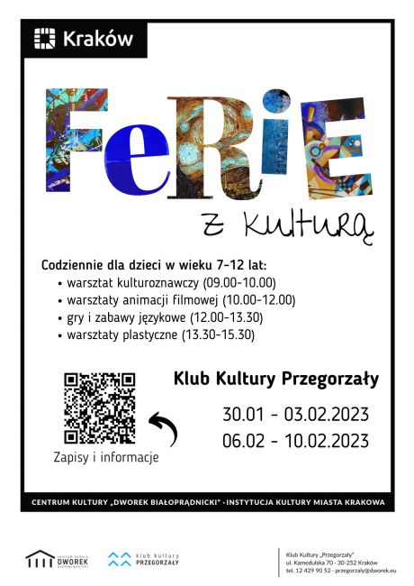 Wasze dzieci spędzają ferie zimowe w mieście? Zapraszamy na nasze warsztaty artystyczno-kulturalne w terminach 30.01. - 03.02.2023 oraz 06.02. - 10.02.2023. Co roku przygotowujemy autorski program zajęć, w którym znajdą się warsztaty plastyczne, kulturoznawcze, animacja filmowa oraz gry i zabawy językowe. Łączymy swobodną zabawę z edukacją artystyczną, zapewniając dzieciom wspaniały, spędzony różnorodnie i kreatywnie czas.