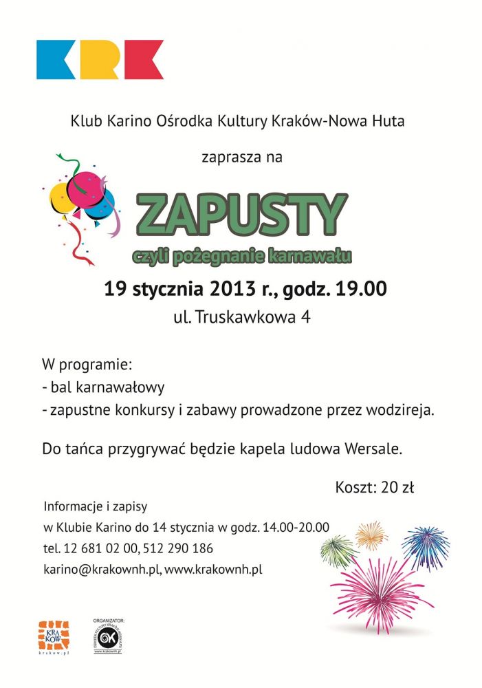 Klub Karino Oœrodka Kultury Kraków-Nowa Huta (ul. Truskawkowa 4) zaprasza na zapusty.