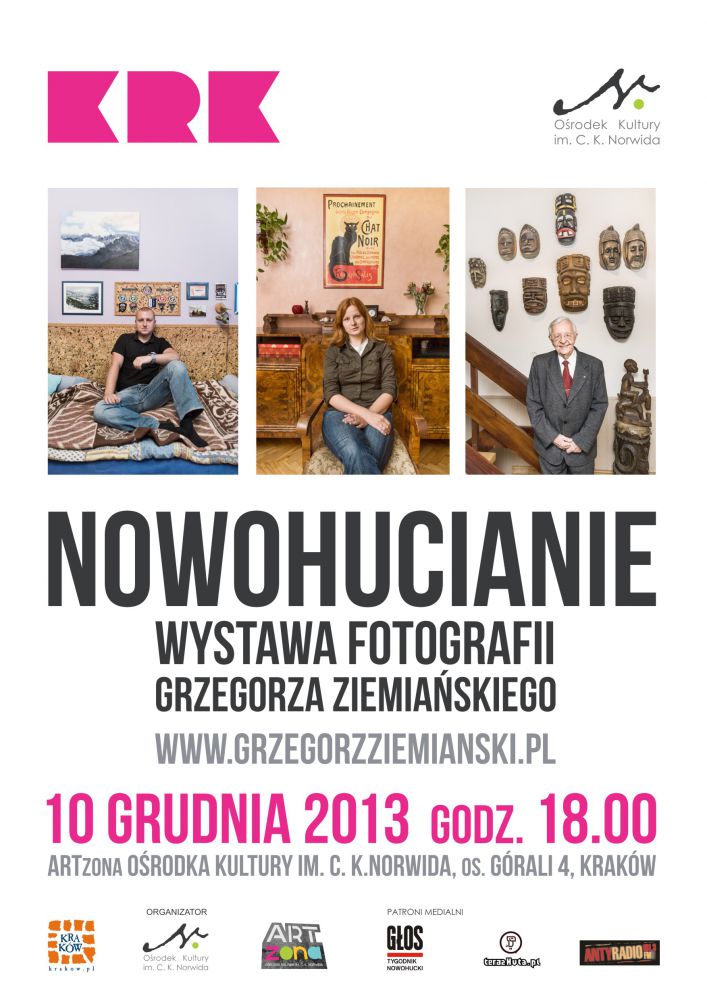 Nowohucianie Grzegorza Ziemiańskiego to wystawa, która towarzyszyła Jubileuszowi 60-lecia Nowej Huty. Autor od wielu lat fotografuje wybitnych mieszkańców Nowej Huty. Spotkanie przy wystawie w ARTzonie, będzie okazjš do poznania dalszych losów tego niezwykle interesujšcego i ważnego dla dzielnicy projektu. Wystawa w ramach uroczystego otwarcia ARTzony Orodka Kultury im. C. K. Norwida