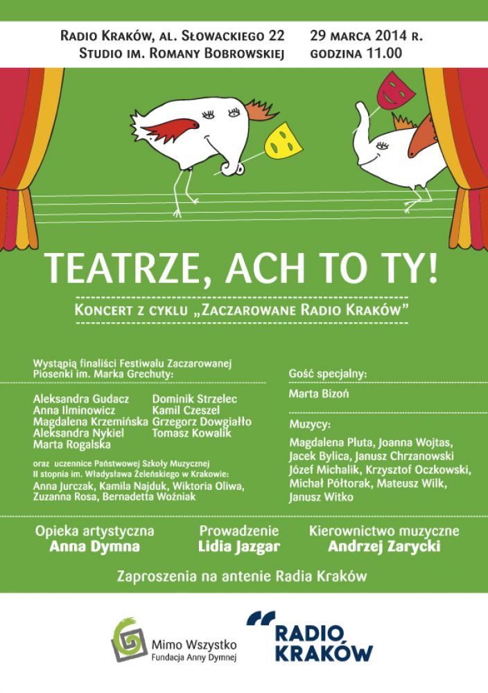 29 marca, w Studiu im. Romany Bobrowskiej Radia Kraków, odbędzie się 21. koncert z cyklu Zaczarowane Radio Kraków, podczas którego finalici i laureaci Festiwalu Zaczarowanej Piosenki im. Marka Grechuty zapiewajš utwory powięcone teatrowi.