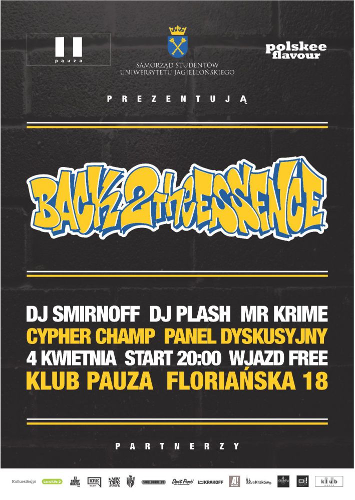 Podziemia klubu Pauza wypełniš tancerze Breaking Hip Hop i Popping z całej Polski i Europy wschodniej. Muzycznie Krakowscy wyjadacze Dj Plash i Mr. Krime będš tego dnia wspierani przez specjalnego goœcia z Rosji - DJ Smirnoff’a. Takie połšczenie to muzyczna bomba!