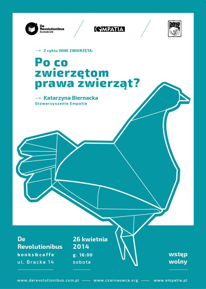 Fundacja Czarna Owca Pana Kota we współpracy ze Stowarzyszeniem Empatia i księgarniš De Revolutionibus. Books&Cafe zaprasza na spotkanie z Katarzynš Biernackš „Po co zwierzętom prawa zwierzšt?”.