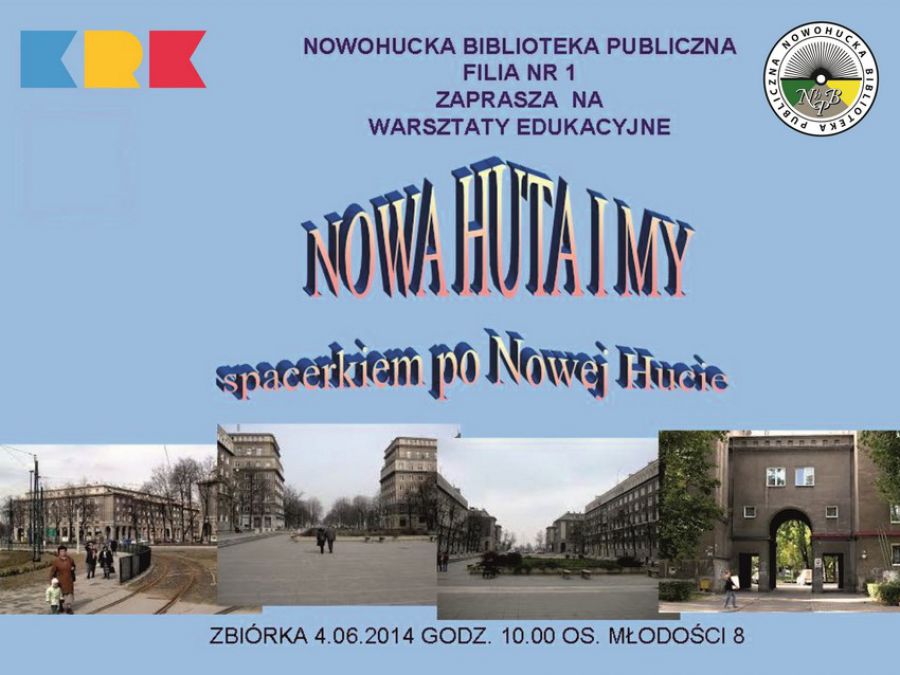 Warsztaty edukacyjne odbędš się w cyklu: Edukacja regionalna. Będzie to spacer po zabytkach i ciekawych, najbardziej rozpoznawalnych miejscach Nowej Huty, które dzięki swojej architekturze i specyfice urbanistycznej tworzš niepowtarzalny klimat. Przewodnikiem będzie animator ze Stowarzyszenia Szersze Horyzonty, który opowie również o poczštkach powstawania miasta zbudowanego dla pracowników kombinatu metalurgicznego, a 1 stycznia 1951 włšczonego do Krakowa jako jedna z jego dzielnic. Zwrócenie uwagi uczestników spaceru na wartoci duchowe, intelektualne i materialne przyczyni się do identyfikacji z Małš Ojczyznš i zachęci do aktywnego i wiadomego udziału w życiu wspólnoty lokalnej jakš jest Nowa Huta.