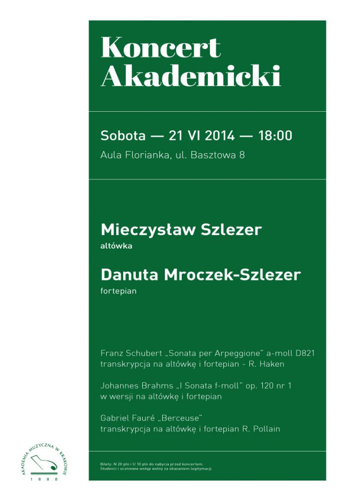 W sobotę 21 czerwca o godzinie 18:00 w Auli Florianka zagra duet cenionych pedagogów Akademii Muzycznej w Krakowie: Mieczysław Szlezer - altówka oraz Danuta Mroczek-Szlezer - fortepian. W programie koncertu znajdš się: