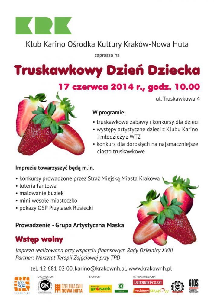 Klub Karino Oœrodka Kultury Kraków-Nowa Huta (ul. Truskawkowa 4) organizuje 17 czerwca 2014 r. w godz. 10.00-14.00 najpyszniejsze krakowskie obchody Dnia Dziecka.