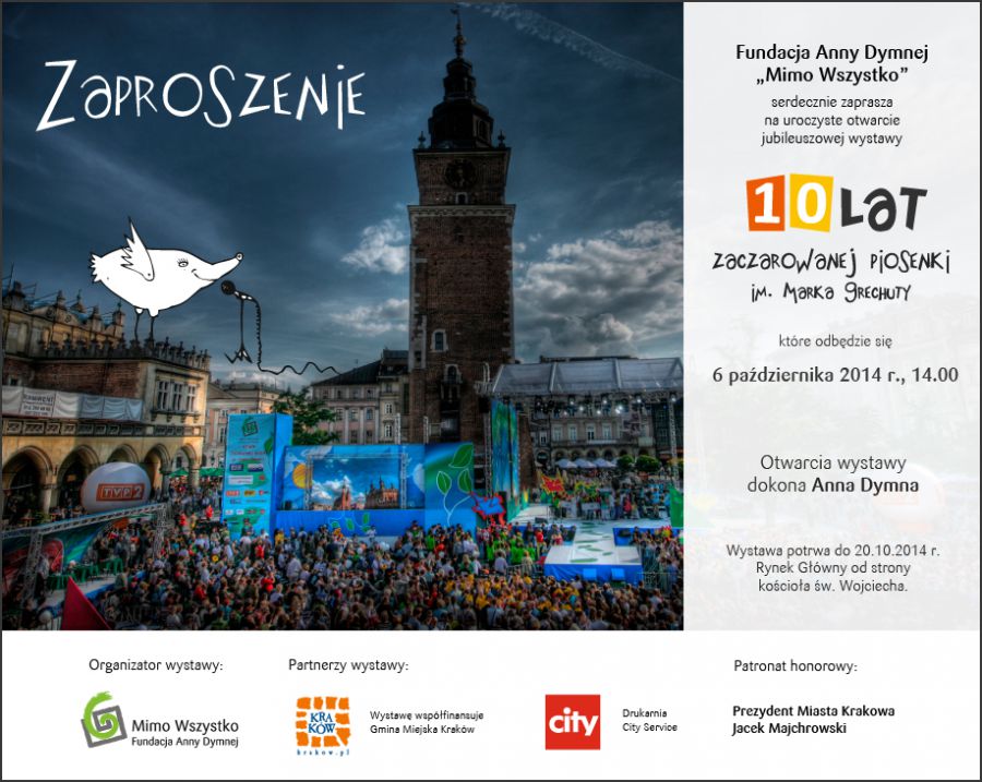 6 padziernika, o 14.00, na Rynku Głównym w Krakowie, Anna Dymna otworzy plenerowš wystawę 10 lat Festiwalu Zaczarowanej Piosenki im. Marka Grechuty. Pierwsza edycja tego trzyetapowego konkursu dla utalentowanych wokalnie osób niepełnosprawnych odbyła się w 2005 roku. W dziesięciu finałach wystšpiło 124 piosenkarzy. Towarzyszyło im 58 największych gwiazd polskiej sceny muzycznej.
