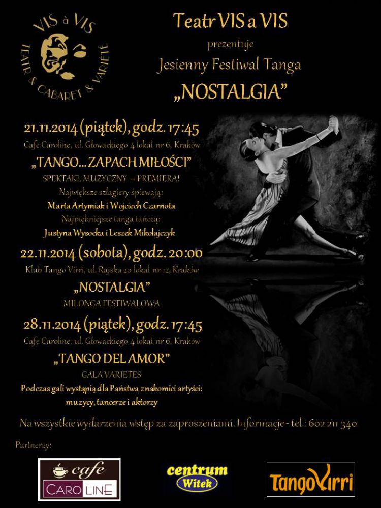 NOSTALGIA to pierwszy w Krakowie, kameralny festiwal poœwięcony tangu w wymiarze tańca, piosenki i literatury zapraszajšcy publicznoœć do krainy pasji i namiętnoœci.