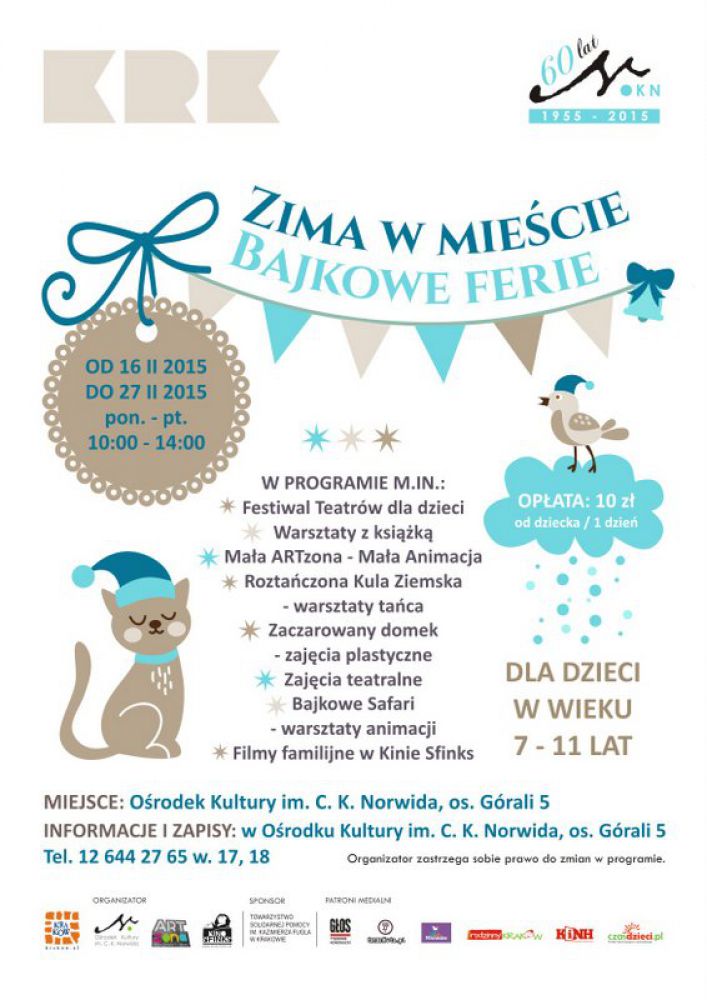 Orodek Kultury im C. K. Norwida serdecznie zaprasza na Bajkowe ferie, czyli kolejnš odsłonę cyklu zajęć dla dzieci w ramach Zimy w miecie od 16 do 27 lutego 2015 od poniedziałku do pištku w godzinach 10:00 - 14:00 w Orodku Kultury im. C. K. Norwida na os. Górali 5. Na zajęcia zapraszamy dzieci w wieku 7-11 lat.