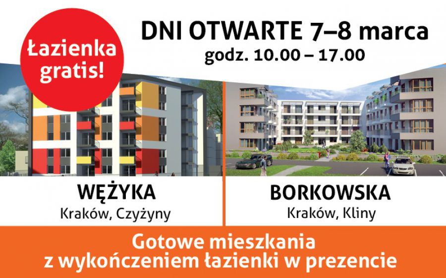 Już w ten weekend, 7-8 marca, nabywcy zainteresowani zakupem mieszkania, będš mogli zobaczyć, jak wyglšdajš energooszczędne inwestycje Wawel Service – Borkowska B1 i B2 oraz Wężyka 10. Z okazji Dni Otwartych deweloper przygotował promocję – przy rezerwacji mieszkania wykończenie i wyposażenie łazienki gratis.