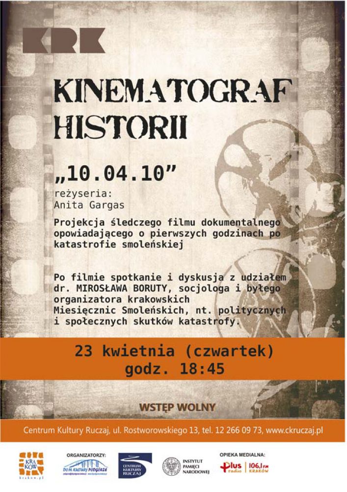 Projekcja ledczego filmu dokumentalnego "10.04.10" w reżyserii Anity Gargas, opowiadajšcego o pierwszych godzinach po katastrofie smoleńskiej.
