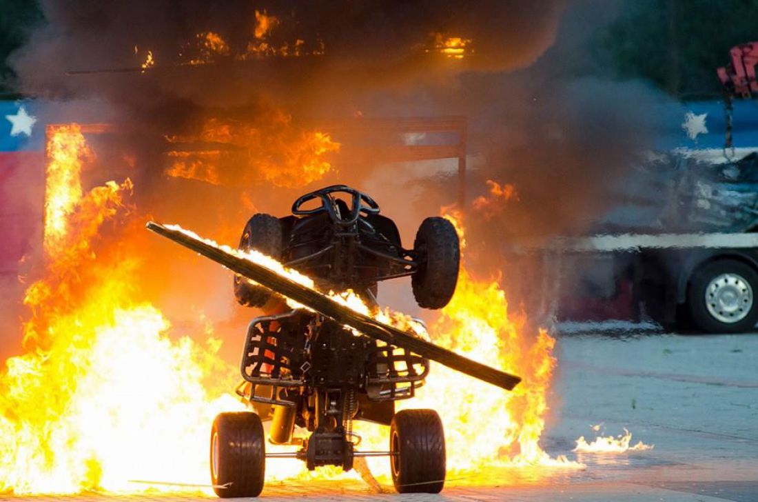 * przejazd przez œcianę ognia z człowiekiem na masce pojazdu;