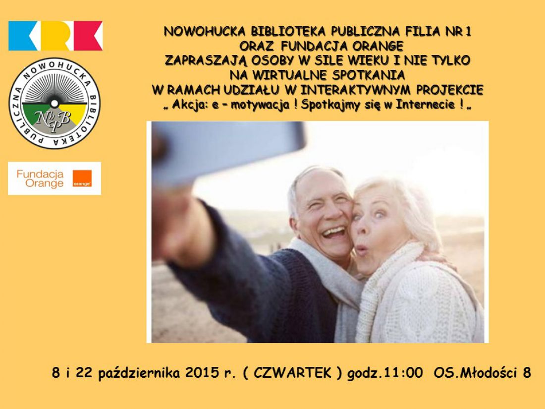 Filia nr 1 Nowohuckiej Biblioteki Publicznej w Krakowie uczestniczy w projekcie Fundacji Orange AKCJA: E-MOTYWACJA, której celem jest poszerzenie oferty edukacyjnej Biblioteki o innowacyjne zajęcia dla osób starszych oraz ich aktywizacja i wspieranie w rozwoju osobistym i społecznym. Biblioteka zaprasza wszystkich Seniorów i nie tylko na wirtualne spotkania. Internet i nowe technologie będš wykorzystane jako narzędzie do odkrywania œwiata i pokonywania społecznych barier. Uczestnicy spotkania połšczš się ze studiem za poœrednictwem Internetu i obejrzš transmitowane przez Fundację Orange spotkanie online, którego goœciem będzie pisarka i felietonistka Krystyna Kofta. Będš też mieć możliwoœć zadawania pytań.