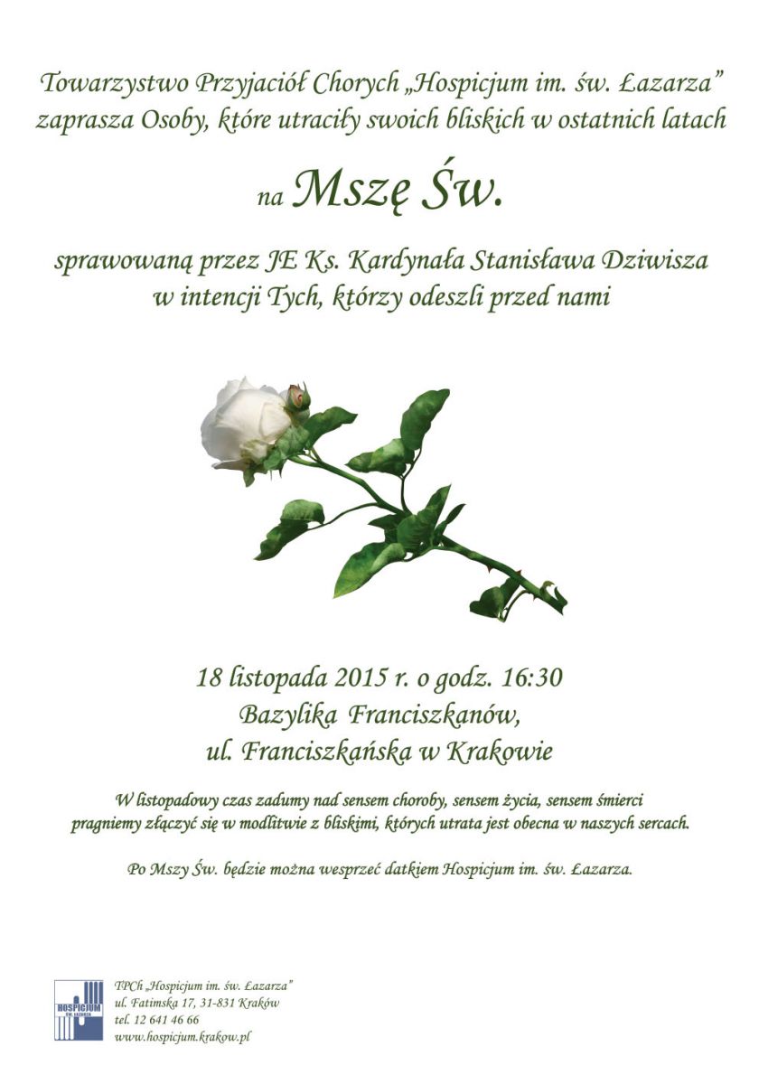 Towarzystwo Przyjaciół Chorych Hospicjum im. w. Łazarza serdecznie zaprasza na Mszę w. sprawowanš przez JE Ks. Kardynała Stanisława Dziwisz, w intencji Tych, którzy odeszli przed nami, 18 listopada 2015 r. o godz. 16.30 Bazylika Ojców Franciszkanów, ul. Franciszkańska w Krakowie. W listopadowy czas zadumy nad sensem choroby, sensem życia, sensem mierci pragniemy złšczyć się w modlitwie z bliskimi, których utrata jest obecna w naszych sercach.