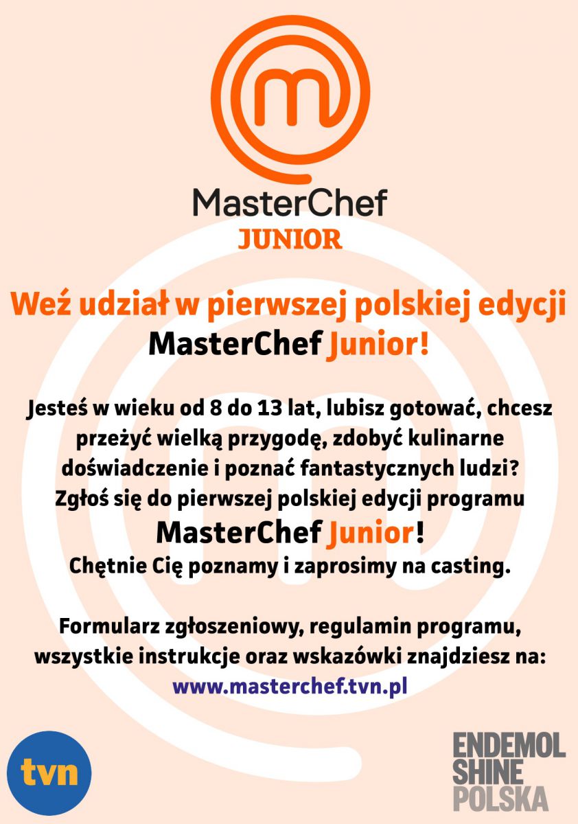 Dzieci i rodziców zainteresowanych programem MasterChef Junior zapraszamy na stronę internetowš www.masterchef.tvn.pl. Za jej porednictwem można zgłosić się do konkursu. Wystarczy pobrać i uzupełnić formularz zgłoszeniowy, a następnie odesłać go w formie elektronicznej na adres junior@tvn.pl. Jeli zgłoszenie będzie spełniało wszystkie kryteria, redakcja programu zaprosi na casting i poinformuje o jego szczegółach.