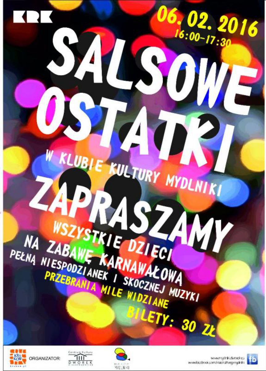 Jak karnawał to karnawał! A w nim wyjčtkowy bal dla wyjčtkowych Goœci! Zapraszamy wszystkie dzieci na niezapomniane Salsowe Ostatki z Crema Dance! W programie: skoczna muzyka, animatorzy, dużo tańca, dużo radoœci, niespodzianek i atrakcji! Kostiumy karnawałowe baaaardzo mile widziane! Zabierzcie koleżanki, kolegów, rodzeństwo oraz rodziców i poszalejcie razem z nami!