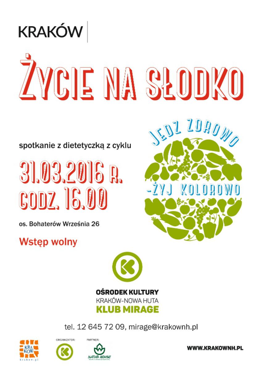 Klub Mirage Orodka Kultury Kraków-Nowa Huta (os. Bohaterów Wrzenia 26) zaprasza 31 marca na godz. 16.00 na kolejne spotkanie dla seniorów z cyklu Jedz zdrowo-żyj kolorowo, promujšcego zdrowy styl życia. Zdrowe odżywianie to nie tylko liczenie kalorii. Zbilansowana dieta i aktywnoć fizyczna przyczyniajš się do lepszej jakoci życia i zapobiegajš wielu chorobom. Uczestnicy spotkania dowiedzš się jakie składniki w diecie będš przeciwdziałać problemom ze zdrowiem, a których należy się wystrzegać oraz jak ograniczyć ryzyko niedoboru witamin. Dietetycy pokażš jak komponować posiłki aby wspomagały sprawnoć fizycznš, psychicznš oraz spowalniały procesy starzenia. Spotkania poprowadzš eksperci z Centrum Dietetycznego Naturehouse - wiatowego lidera w dziedzinie dietetyki i żywienia.