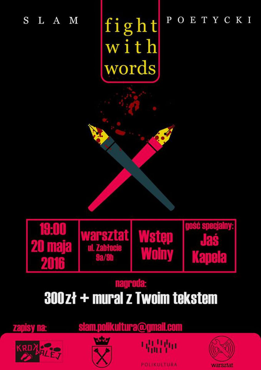 Będzie to literackie spotkanie, gdzie poezja współczesna połšczy się ze sztukš performatywnš. Podczas wydarzenia poeci majš 3 minuty, aby zaprezentować swój utwór. W walce na słowa może wzišć udział każdy, zarówno amator, jak i dowiadczony literat. Gociem specjalnym będzie Jan Kapela, zwycięzca pierwszego w historii polskiego slamu. Fragment zwycięskiego tekstu zostanie uwieczniony w formie muralu na cianie Warsztatu na Zabłociu.