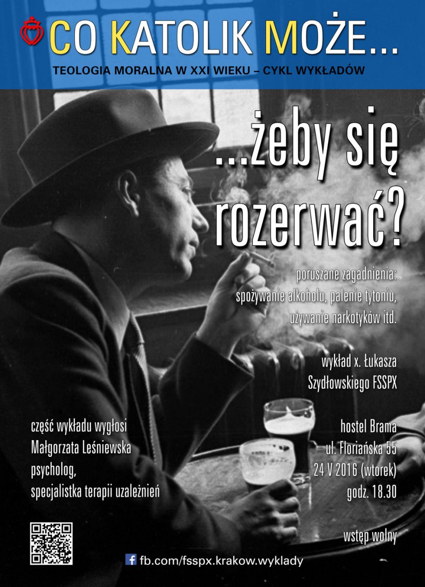 Zastanawiasz się, na co można sobie pozwolić w czasie zabawy? Ciekaw jeste, czy katolikowi wypada korzystać z używek? Nurtuje Ciebie ryzyko uzależnienia od napojów wyskokowych, tytoniu, itd.? W takim razie przyjd wykład ks. Szydłowskiego FSSPX i p. psycholog M. Leniewskiej ze Orodka "Wierzenica"!