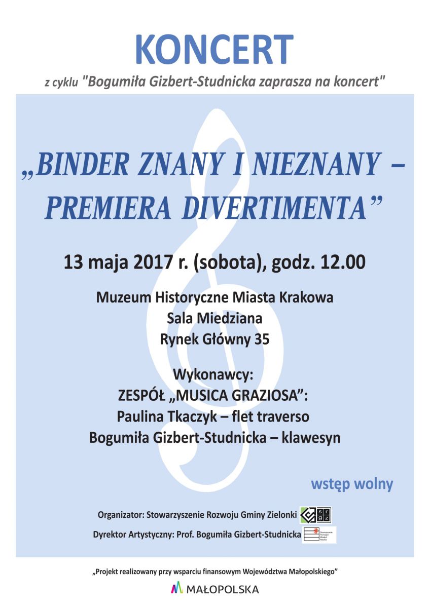 Serdecznie zapraszamy na niezwykły koncert muzyki barokowej Binder znany i nieznany - premiera Divertimenta (13.05, godz. 12, Muzeum Historyczne Miasta Krakowa), podczas którego zaprezentowane zostanš utwory Christlieba Siegmunda Bindera, muzyka drezdeńskiej kapeli, artysty dynamicznego, łšczšcego w swej twórczoci wiele kierunków i stylów. Binder zafascynowany był klawesynem, tworzył głównie sonaty i koncerty na ten instrument. Już przez ówczesnych teoretyków muzyki uznawany był za kompozytora tworzšcego z pasjš, pełnego wyrazu i namiętnoci.