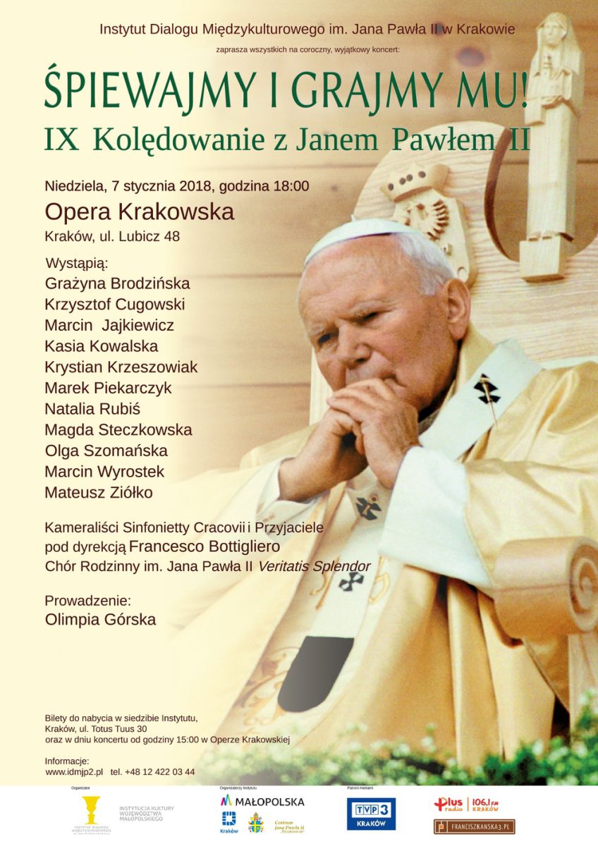 Instytut Dialogu Międzykulturowego im. Jana Pawła II w Krakowie serdecznie zaprasza 7 stycznia 2018 roku o godzinie 18.00 do Opery Krakowskiej na wyjštkowy koncert kolęd.
