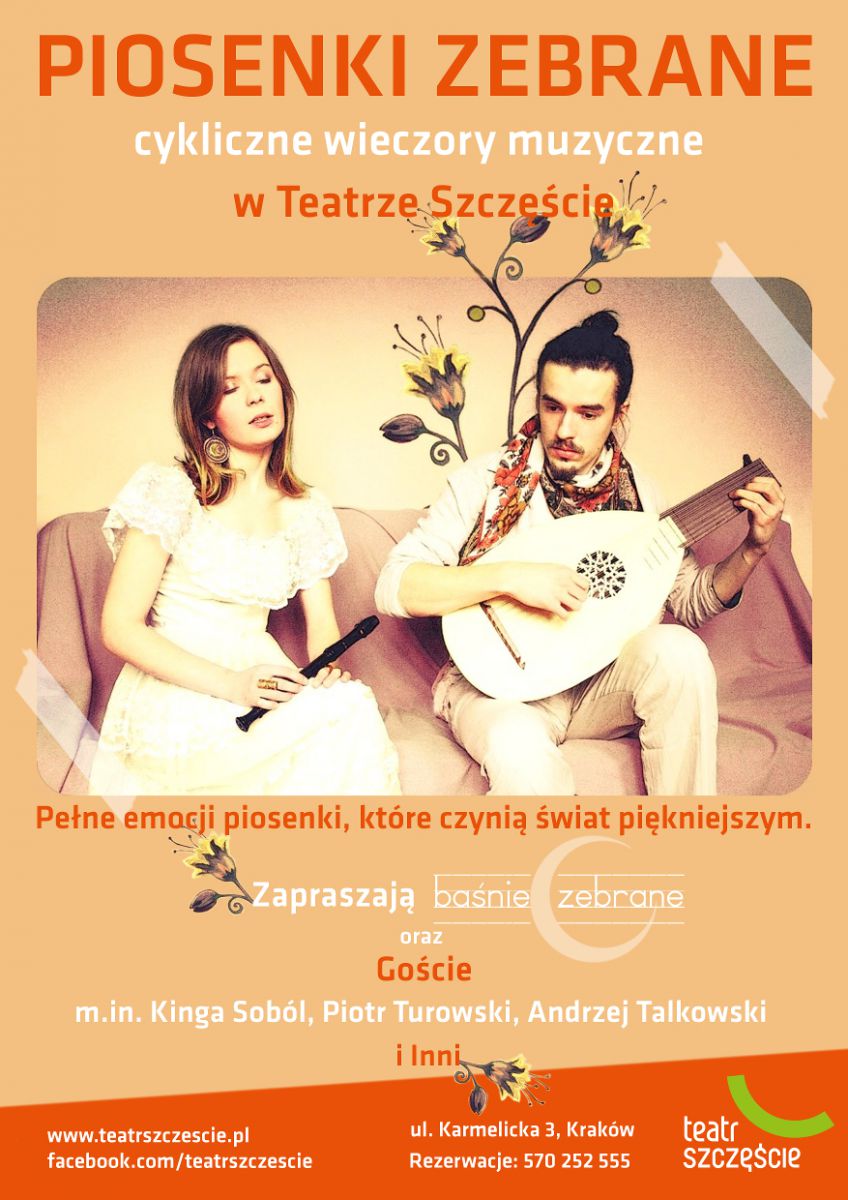 Zapraszamy na cykliczne spotkania z piosenkš w Teatrze Szczęcie, prowadzone przez Beatę i Michała z Bani Zebranych. Każdy wieczór to inny zestaw piosenek, inne emocje i oczywicie Gocie. Bo te wieczory będš współtworzyć zaproszeni Artyci, dzielšc się swoimi muzycznymi fascynacjami i wrażliwociš. A wszystko to, Drogi Widzu, by uczynić Twój i nasz wiat piękniejszym!