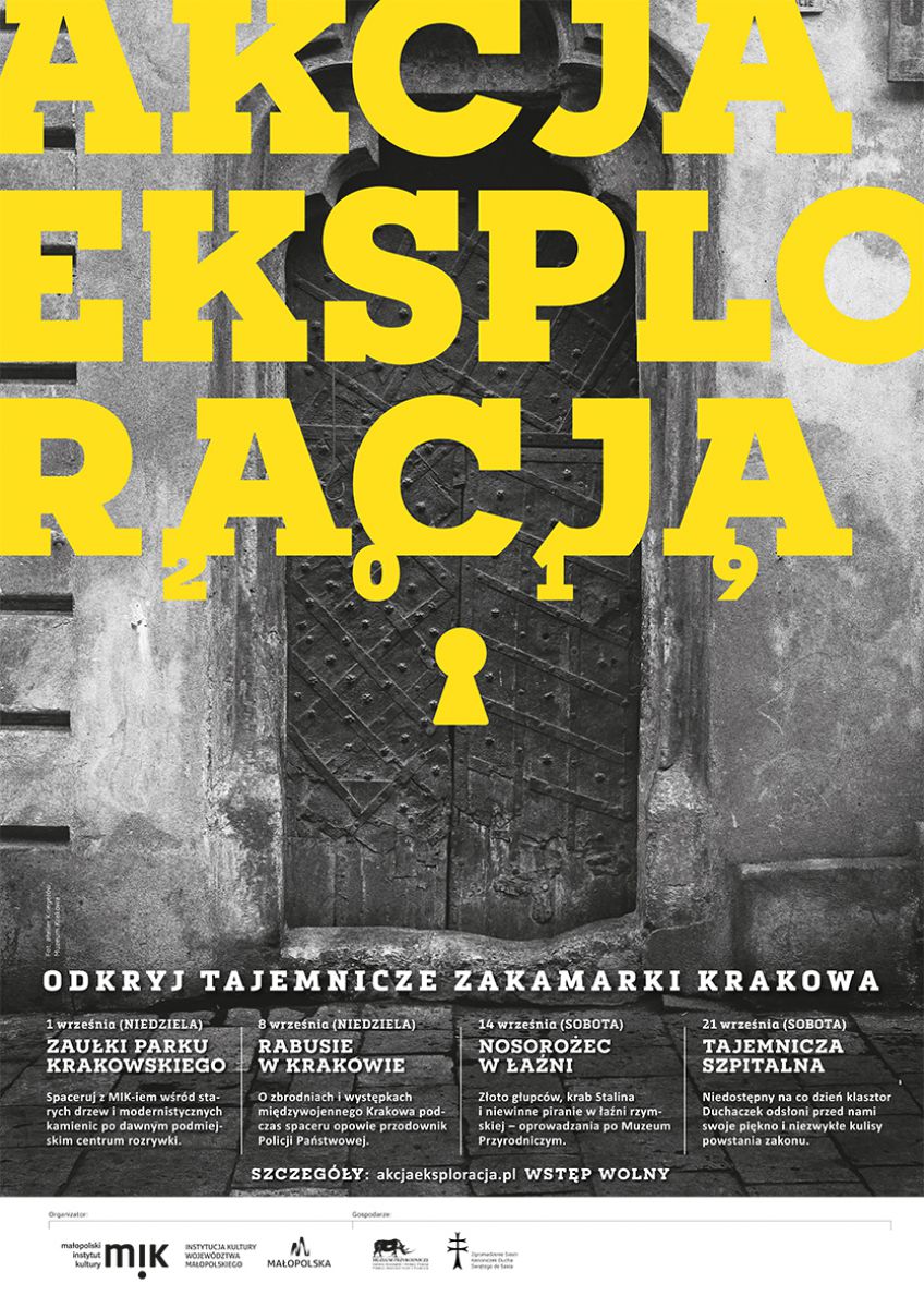 Małopolski Instytut Kultury w Krakowie po raz kolejny zaprasza na cykl spacerów i oprowadzań po Krakowie. Akcja Eksploracja to jesienny cykl wydarzeń, podczas których odkrywamy miejsca i historie zwišzane z dziedzictwem kulturowym Krakowa i okolic. Zapraszamy do udziału w bezpłatnych spacerach i oprowadzaniach, do odwiedzenia atrakcyjnych obiektów i wysłuchania interesujšcych opowieœci. Jest to nierzadko jedyna szansa na wejœcie do miejsc na co dzień niedostępnych dla zwiedzajšcych oraz odkrycie mało znanych dziejów Małopolski. Spacery i oprowadzania poprowadzš przewodnicy – specjaliœci i pasjonaci, znajšcy najgłębsze tajemnice prezentowanych miejsc. Udział we wszystkich wydarzeniach jest bezpłatny. Na niektóre wydarzenia obowišzuje rezerwacja przez formularz on-line.