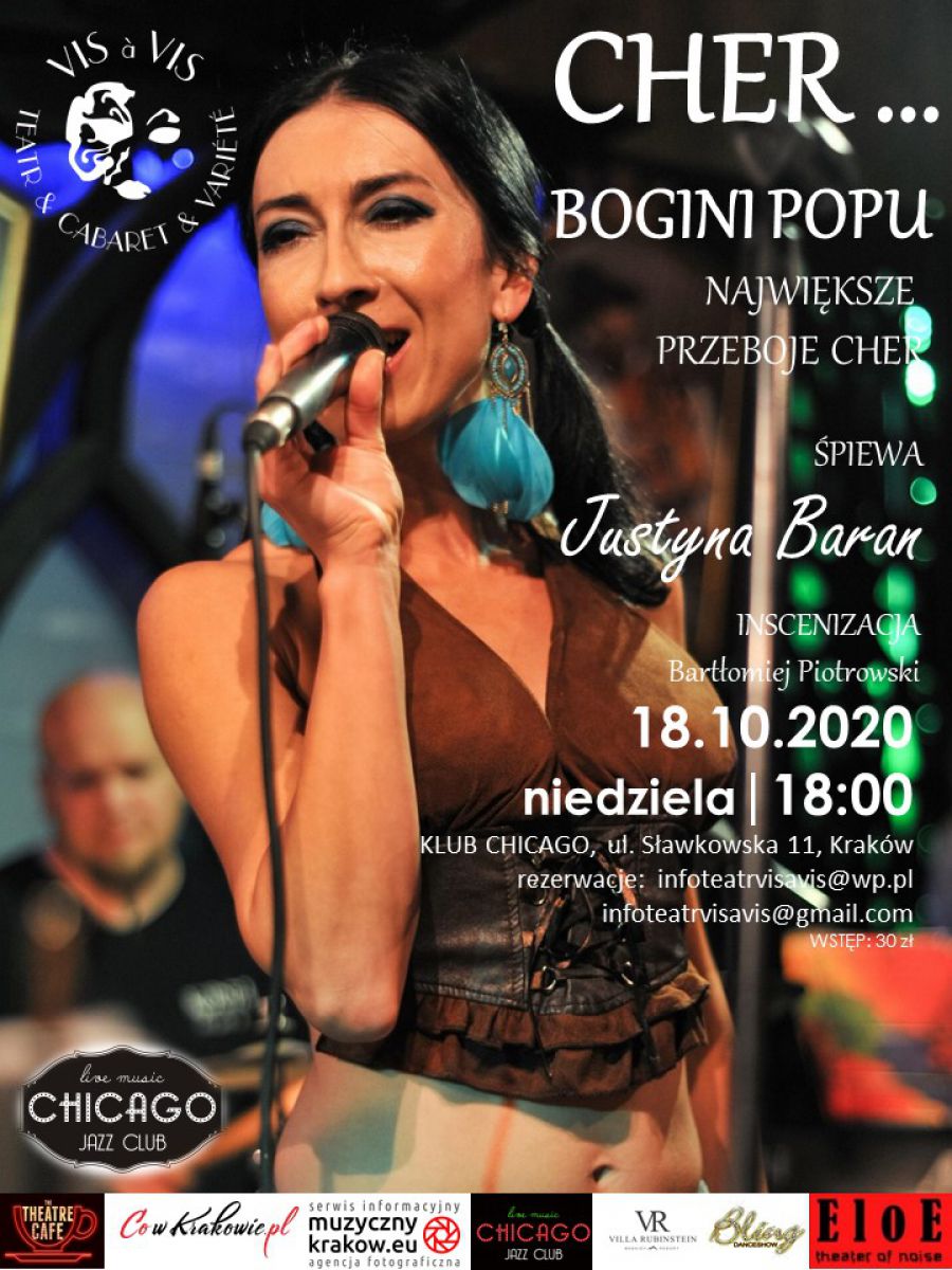 Podczas koncertu największe przeboje CHER – BOGINI POPU zaœpiewa dla Państwa artystka Teatru VIS A VIS – aktorka i wokalistka obdarzona niezwykłym głosem oraz ogromnym temperamentem scenicznym JUSTYNA BARAN.