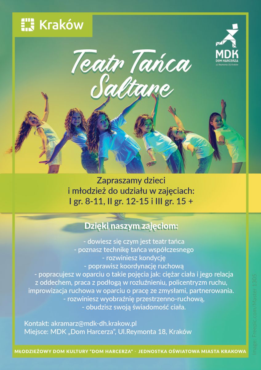 Zapraszamy wszystkie chętne dzieci do pracowni Teatru Tańca „Saltare”. Jeśli lubisz się ruszać, a na scenie czujesz się jak ryba w wodzie to te zajęcia są właśnie dla Ciebie! Pracujemy w trzech grupach wiekowych: