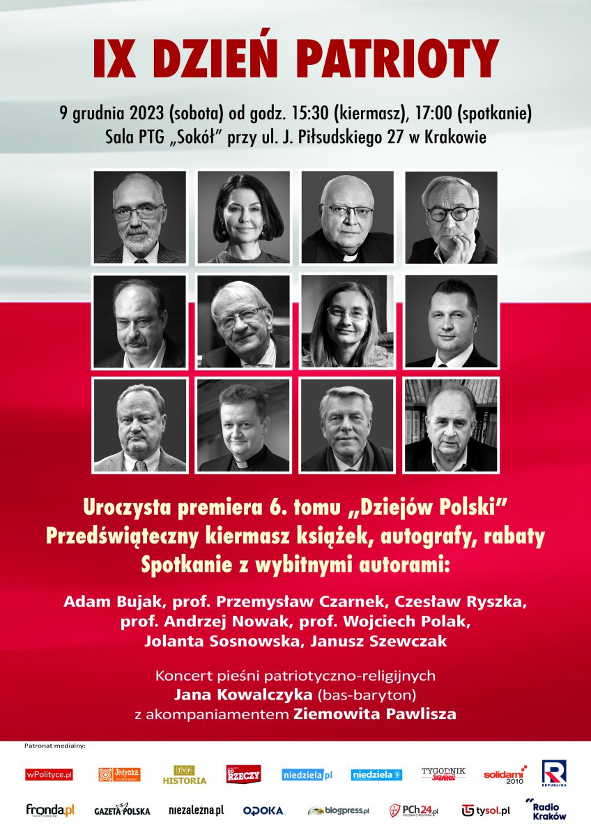 Warto podkreślić, że podczas IX Dnia Patrioty odbędzie się także oficjalna premiera szóstego tomu „Dziejów Polski”, w których prof. Andrzej Nowak opisuje lata 1632-1673 w naszej historii. Jest to burzliwy okres i wraz z Autorem śledzimy, jak zmienia się Rzeczpospolita szlachecka. Nie zmienia się na lepsze. Przekształca się w Rzeczpospolitą magnacką. Słabnie pozycja króla, a królować zaczyna swawola, sobiepaństwo, a nawet zdrada. Powoli degeneruje się szlachta, na której przez tyle wieków opierała się obrona Ojczyzny. Degeneruje się wolna elekcja, ten symbol, już tylko pozorny, szlacheckiej wolności albo, jak byśmy dziś powiedzieli, demokracji. Osłabienie kraju natychmiast skłania sąsiadów do najazdów i łupiestwa, stąd też podtytuł szóstego tomu „Dziejów Polski”: „Potop i ogień”.