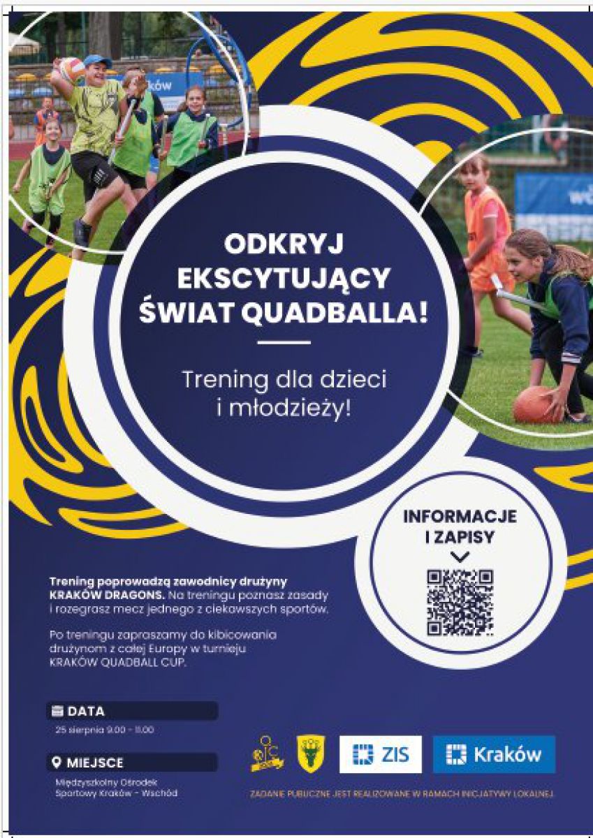 Zapraszamy wszystkie dzieci i młodzież na wyjątkowy trening quadballa! To fantastyczna okazja, aby poznać tę dynamiczną i pełną emocji grę, która łączy elementy piłki ręcznej, rugby i zbijaka. Quadball to sport drużynowy i koedukacyjny, który rozwija umiejętności fizyczne, strategiczne myślenie oraz współpracę w zespole.