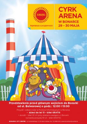 W sobotę i niedzielę, 29 i 30 maja, miłonicy widowiskowej akrobacji, poskramiania dzikich zwierzšt, występów klaunów i innych sztuk cyrkowych, będš mogli zobaczyć występy Cyrku Arena. Spektakle odbędš się w sobotę i niedzielę o godz. 12:00 i 15:00, przed głównym wejciem do Bonarki (od strony ul. Bulwarowej). Przed każdym przedstawieniem chętni będš mieli możliwoć przejażdżki na kucyku i