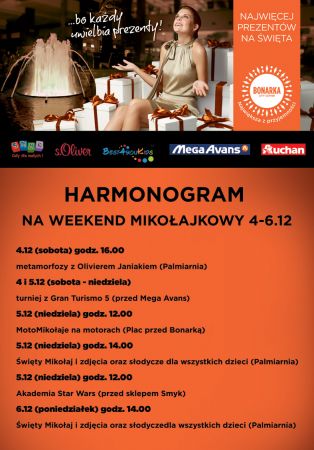 W dniach 4 – 6 grudnia, z okazji Mikołajek, Bonarka przygotowała atrakcje dla małych i dużych dzieci. Na motocyklach przyjedzie prawie 100 Mikołajów, miłoœnicy szybkiej jazdy będš mogli zmierzyć się w Gran Turismo 5, Olivier Janiak doradzi w zakupowych szaleństwach, a każde dziecko - może liczyć na zdjęcie i niespodziankę od Mikołaja.