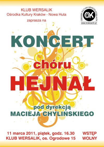 Klub Wersalik Orodka Kultury Krakw-Nowa Huta zaprasza na koncert Chru Hejna. W programie koncertu znajd si utwory najwybitniejszych kompozytorw polskich i zagranicznych, t.j.: S. Moniuszko, J. Maklakiewicz, L. van Beethoven, F. Schubert, J. Brahms, J. Strauss, G. Verdi, W. A. Mozart.