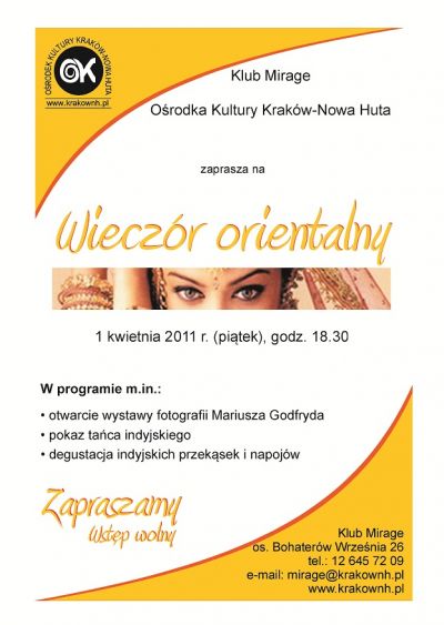 Klub Mirage Orodka Kultury Krakw Nowa Huta zaprasza na otwarcie wystawy Czowiek orientu 1 kwietnia (pitek) 2011 r. o godz. 18.30
