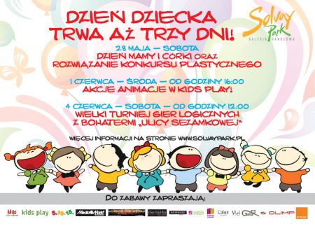 W Galerii Handlowej Solvay Park najmłodsi więtujš aż trzy dni! Bo kto powiedział, że Dzień Dziecka obchodzimy tylko 1 czerwca? Zaczynamy już w najbliższš sobotę, 28 maja atrakcjami dla mam i córek oraz rozwišzaniem konkursu plastycznego.