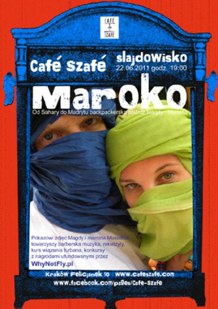 Podczas spotkania Magda i Marcin zaprezentujš zdjęcia ze swojej wyprawy, a wydarzeniu temu towarzyszyć będzie berberska muzyka oraz marokańskie rekwizyty. Chętni będš mogli nauczyć się wišzać turban, powšchać marokańskie przyprawy i zanurzyć dłoń w piasku Sahary. Najbardziej aktywna częć publicznoci będzie miała dodatkowo okazję skosztować berberskš whisky, z oryginalnego srebrnego naczynia zdobytego na suku w Marrakeszu. Podczas spotkania planowane sš również upominki od partnerów wydarzenia: Centrum Nurkowego Nautica i portalu WWW.WhyNotFly.pl