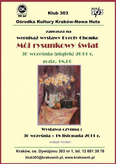 Klub 303 Oœrodka Kultury Kraków – Nowa Huta (os. Dywizjonu 303 paw.1) zaprasza na wernisaż wystawy Doroty Chomko. Wystawa prezentuje rysunki artystki, głównie martwe natury, wykonane pastelami, kredkami, węglem i ołówkiem.