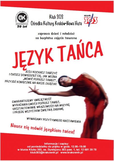 Klub 303 Orodka Kultury Kraków-Nowa Huta (os. Dywizjonu 303) zaprasza dzieci od 9 lat oraz młodzież szkół gimnazjalnych i ponadgimnazjalnych na warsztaty taneczne Język tańca.