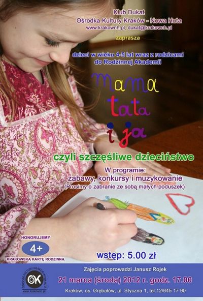 Klub Dukat Oœrodka Kultury Kraków-Nowa Huta (ul. Styczna 1) zaprasza 21 marca (œroda) 2012 r. w godz. 17.00 – 18.00 na zajęcia w ramach Rodzinnej Akademii.