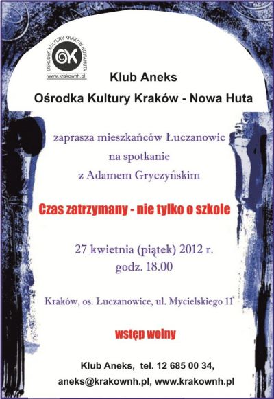 Mieszkacw uczanowic oraz innych krakowskich osiedli Klub Aneks Orodka Kultury Krakw-Nowa Huta zaprasza na spotkanie z Adamem Gryczyskim - fotografem zwizanym z Krakowem, autorem albumw Czas zatrzymany.
