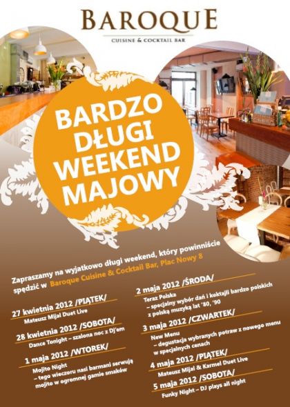 W dniach 27 kwiecień 5 maj krakowski Baroque Cuisine & Cocktail Bar zaprasza na Bardzo Długi Weekend Majowy na Placu Nowym 8! Muzyka na żywo, najlepsze koktajle i wymienita kuchnia to tylko najważniejszych atrakcji jakie będš czekać na wszystkich, którzy te dni postanowiš spędzić w Baroque na Kazimierzu!