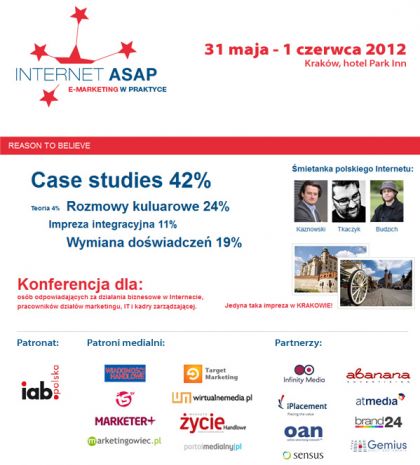 Jedyna taka konferencja! Tylko praktyczne informacje i case studies, dwa dni prelekcji dotyczšcych najnowszych trendów i efektywnych rozwišzań marketingowych w Internecie, a ponadto okazja do spotkania z praktykami branży marketingowej i największymi osobowoœciami polskiego Internetu – tak w skrócie zapowiada się konferencja Internet ASAP, która w dniach 31 maja i 1 czerwca odbędzie się w Krakowie.