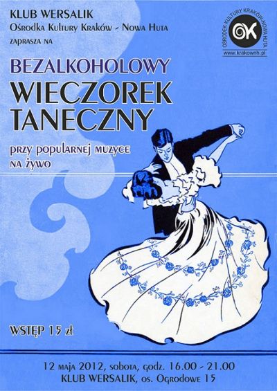 Klub Wersalik Oœrodka Kultury Kraków-Nowa Huta (os. Ogrodowe 15) zaprasza dorosłych i seniorów na kolejny bezalkoholowy wieczorek taneczny przy popularnej muzyce na żywo.