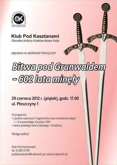Klub Pod Kasztanami Orodka Kultury Kraków-Nowa Huta (ul. Płoszczyny 1) zaprasza na spotkanie powięcone twórczoci Józefa Ignacego Kraszewskiego, ze szczególnym uwzględnieniem powieci historycznej Krzyżacy 1410: Obrazy z przeszłoci, wydanej z okazji 600-ej rocznicy grunwaldzkiej bitwy.