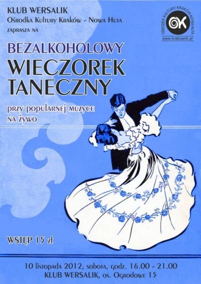 Klub Wersalik Oœrodka Kultury Kraków-Nowa Huta (os. Ogrodowe 15) zaprasza na kolejny bezalkoholowy wieczorek taneczny.