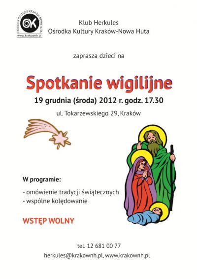 Podczas spotkania w Klubie Herkules Orodka Kultury Krakw-Nowa Huta najmodsi poznaj tradycje witeczne zwizane z ubieraniem choinki, przygotowaniem potraw witecznych i dekoracj stou. Nie zabraknie rwnie wsplnego koldowania.