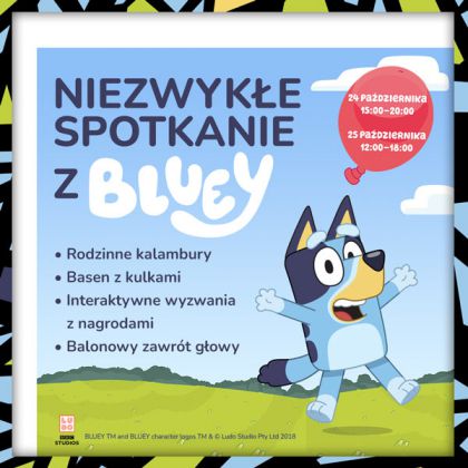Spotkanie z Bluey odbędzie się w Galerii Bronowice w piątek, 24 października, w godz. 15:00-20:00 oraz w sobotę, 25 października, w godz. 12:00-18:00.