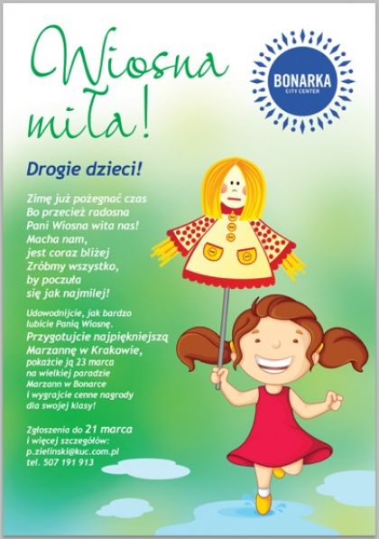 Cho mija ju poowa marca, zima najwyraniej nie chce nas opuci. Nadaremno wygldamy dni penych soca, zielonych lici i pierwszych kwiatw, ktre wci si nie pojawiaj. Caa nadzieja w dzieciach, ktre za pomoc sowiaskiego rytuau pomog odegna mron pani i godnie przywitaj tchnc yciem imioci soneczn wiosn. W Bonarce dzieci nie tylko pomog przegna zim, ale take zawalcz o cenne nagrody: autorzy 3 najlepszych marzann otrzymaj bony o wartoci 500 z na zakupy przyborw szkolnych w Empiku.