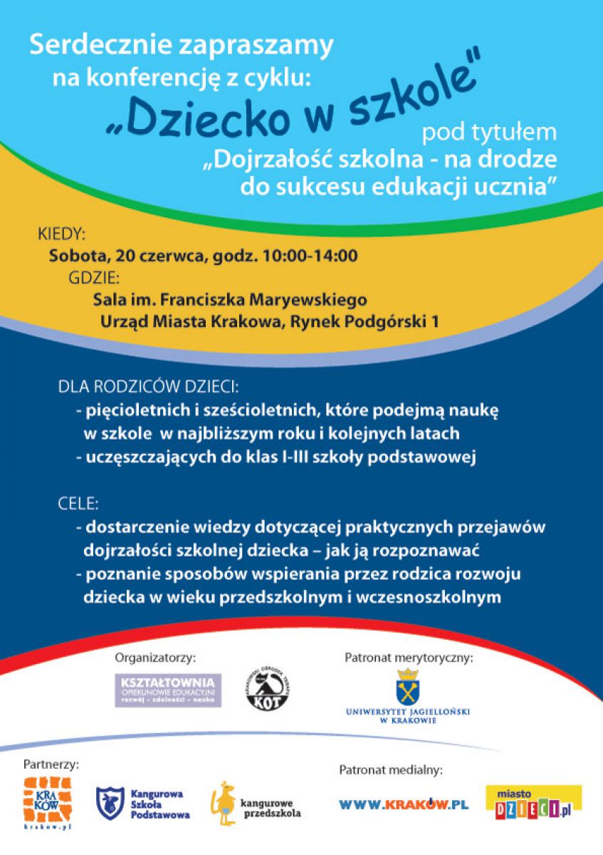 Pierwszy w Krakowie cykl konferencji skierowany do rodzicw, poruszajcy wane tematy dotyczce dziecka w szkole. Inicjatywa jest zaproszeniem do dialogu.